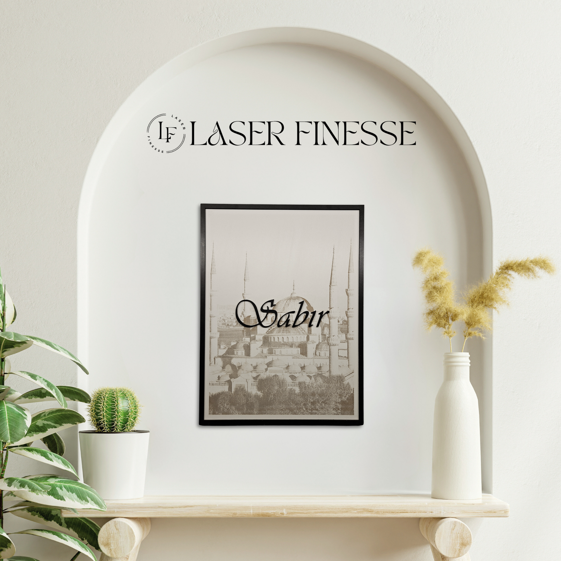 Unser islamisches Wandbild vereint eines der stärksten Wörter "Sabır" (Geduld), mit der Schönheit der Sultan Ahmed Moschee in Istanbul. Die Lasertechnik verleiht dem Kunstwerk eine einzigartige Tiefe und Präzision, die es zu einem wahren Blickfang in jedem Raum macht.